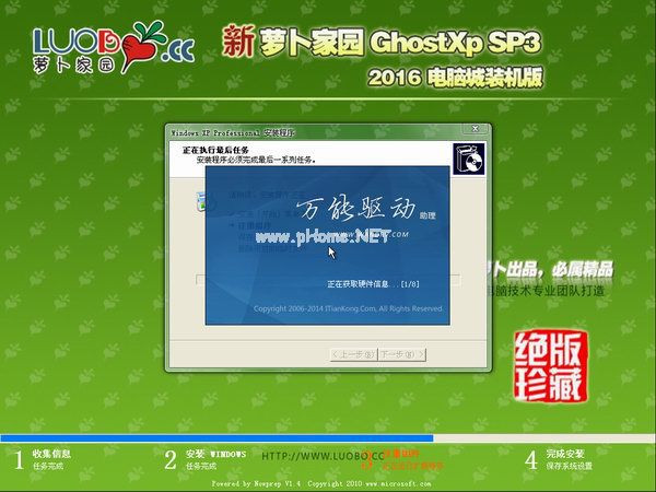 * 安裝過程會運行自主開發的驅動選擇工具,此工具可智能判斷所有的電腦硬件型號,最大限度地避免了因驅動沖突而藍屏的現象。