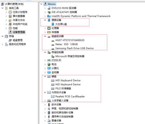 3、打開設備管理器,然后依次點擊右側的驅動器,控制器,設備,查找是否有第三步需要我們記下的那個名字,需要注意的是,我們需要好好找找便攜設備,鍵盤等,看看自己的U盤會不會被識別成其他的設備了。