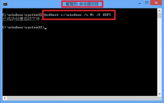 3、用管理員身份打開命令提示符,并輸入bcdboot c:\windows /s X: /f UEFI