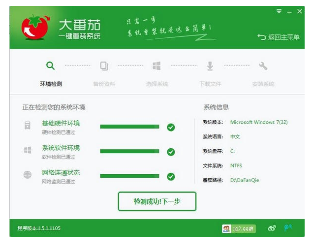 1.下載軟件后,并正常打開,點擊軟件首界面的“立刻重裝”按鈕進入檢測頁面,完成后查看是否檢測成功,成功則點擊“下一步”,失敗請從大番茄官網尋求幫助。