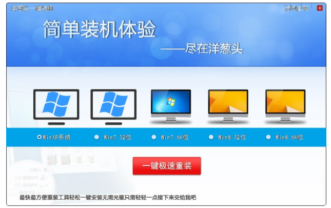 解答:洋蔥頭是一款一鍵自動重裝系統工具,可以選擇重裝xp系統、windows7系統、windows8系統,不需要電腦技術,其次洋蔥頭一鍵裝機安裝非常簡單,全部安裝過程均是自動化操作,不需要你手工操作,更不用擔心什么問題。