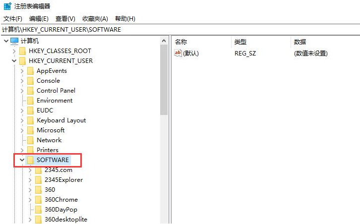 2、進入注冊表編輯器,然后展開HKEY_CURRENT_USER,找到SOFTWARE項。