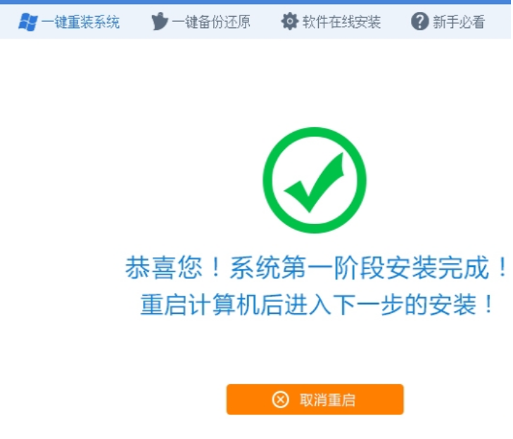 5、下載完成后配置重裝文件,執行倒計時進行系統安裝,第一階段安裝完成后,自動重啟。