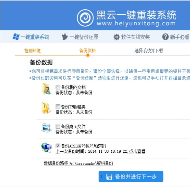 2、在這里選擇需要的數據進行備份,該重裝軟件只刪除系統盤(C盤)數據,其他盤文件不影響,點擊備份并進行下一步。