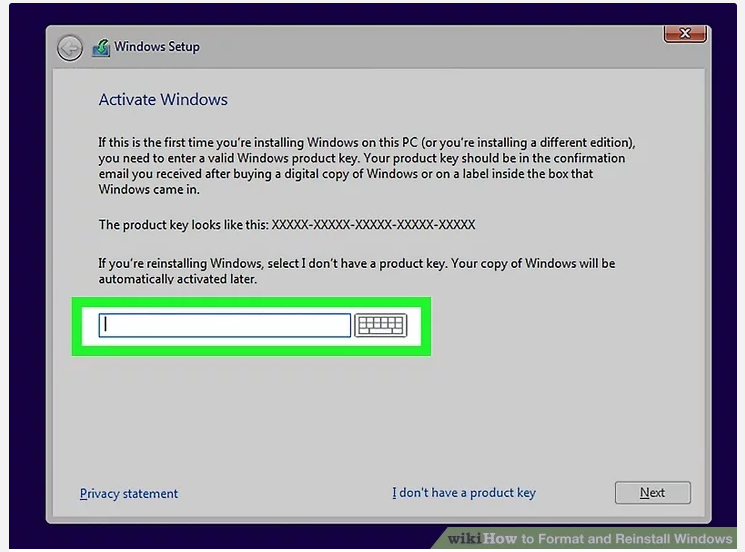 4、接著輸入您的激活密鑰,然后單擊下一步。 需要您的激活密鑰來注冊您的 Windows 副本。如果您在線購買了 Windows,它很可能是通過電子郵件發送給您的。如果您購買了 Windows 的副本,則它在 Windows 的包裝盒中。如果您沒有激活密鑰,請單擊底部的我沒有產品密鑰。這允許您暫時跳過此步驟,但您需要在完成 Windows 安裝后購買激活密鑰。