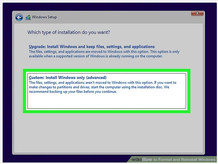 7、若您想重新格式化您的計算機并安裝新版本的 Windows,請單擊執行自定義安裝的選項。