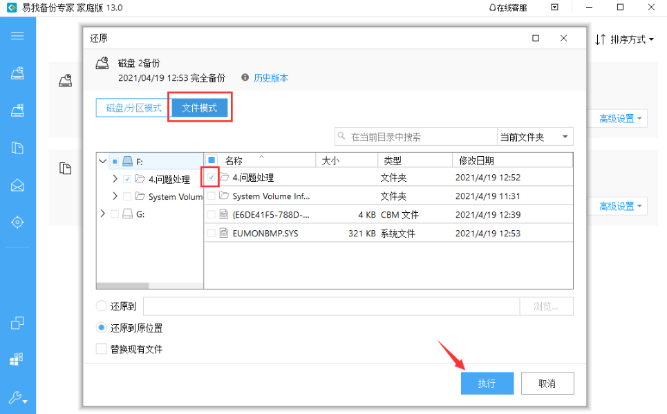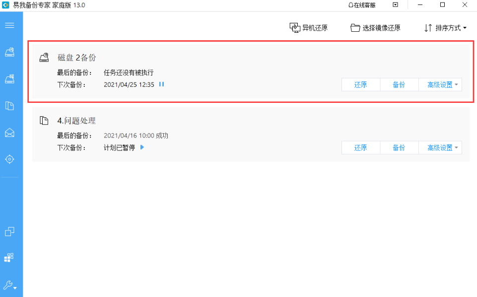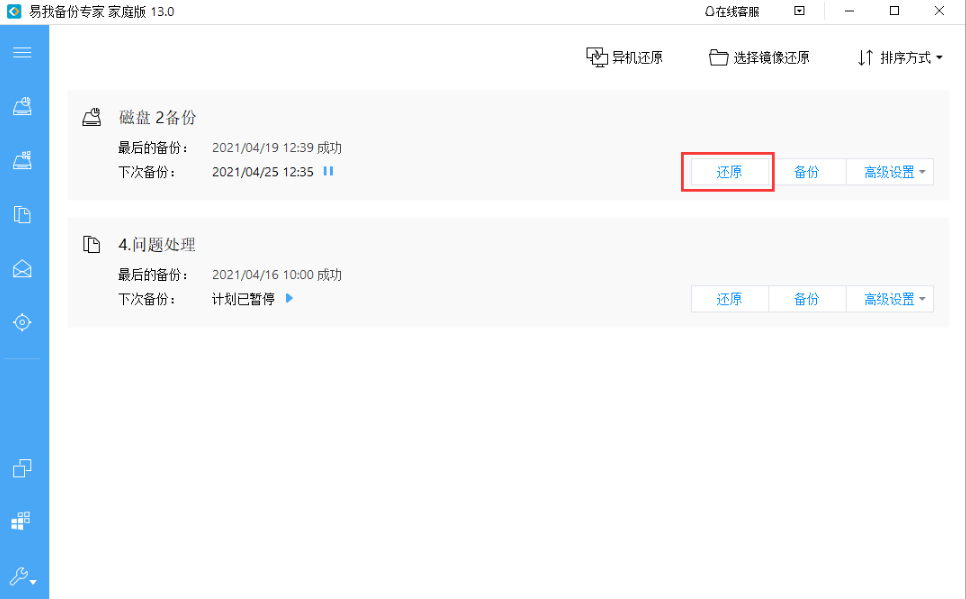 6、選中需要還原的備份任務,點擊“還原”按鈕。