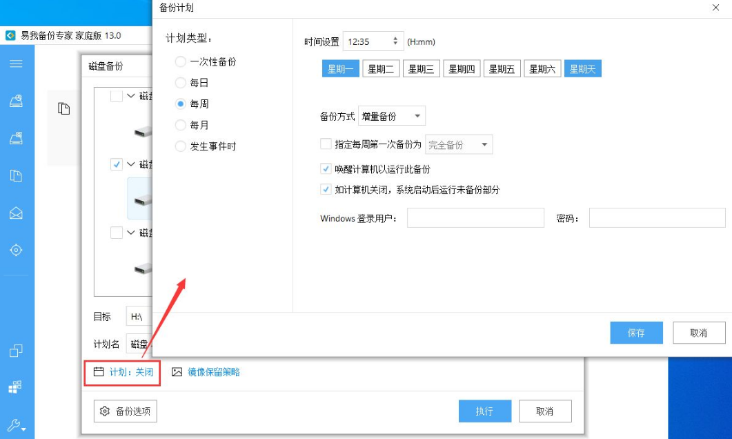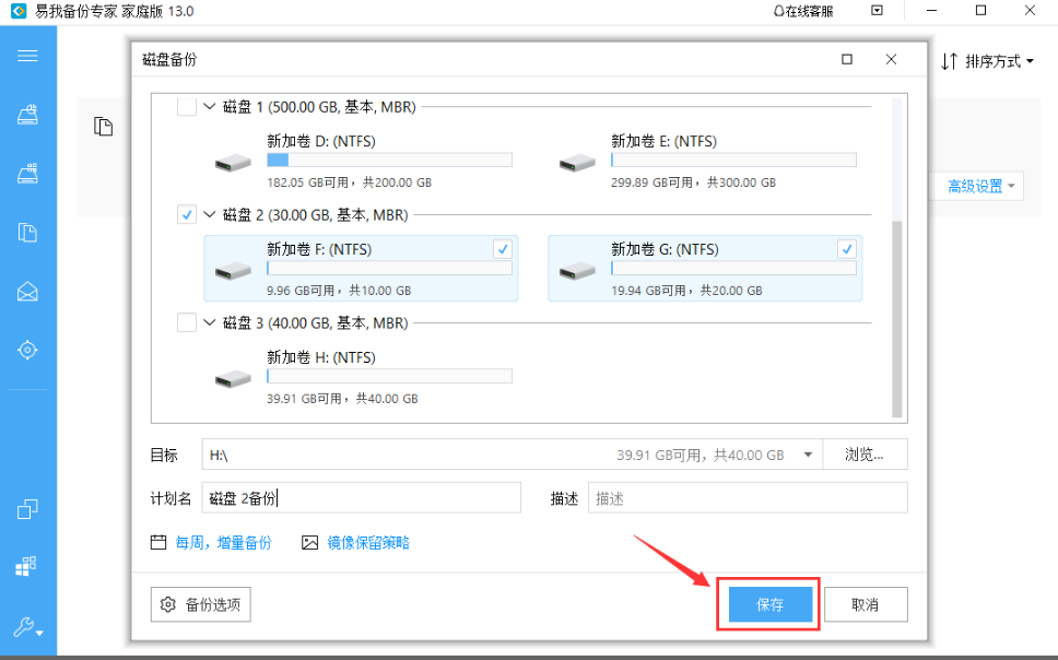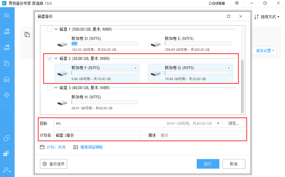 2、選擇需要備份的磁盤/卷,設置好備份計劃名稱、描述以及備份鏡像文件存放的目標路徑。