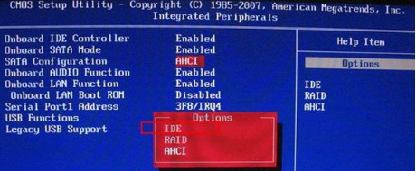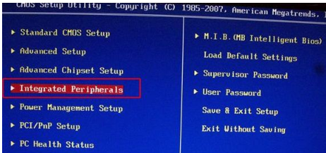 1.當我們的電腦啟動藍屏出現錯誤代碼0x0000007b時,我們先將電腦重啟,在開機時不斷按啟動熱鍵進入到bios設置頁面,進入界面后找到“Integrated Peripherals”選項并回車。