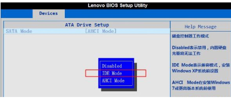 2.然后我們選擇“sata mode”并回車,彈出小窗口后,我們選擇“ide mode”選項,完成操作后按f10進行保存重啟就可以解決藍屏0x0000007b代碼問題啦。