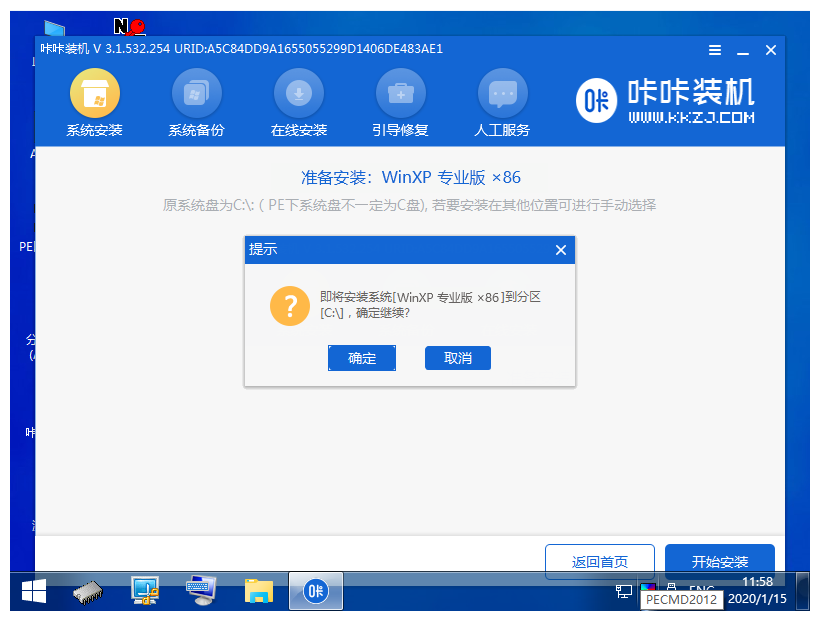 7、進入pe系統界面后,選擇需要安裝的xp系統,點擊安裝。