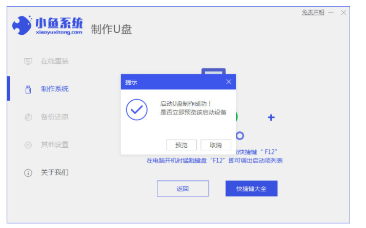 4、制作完成后,預覽需重裝的電腦啟動快捷鍵后,拔出U盤。