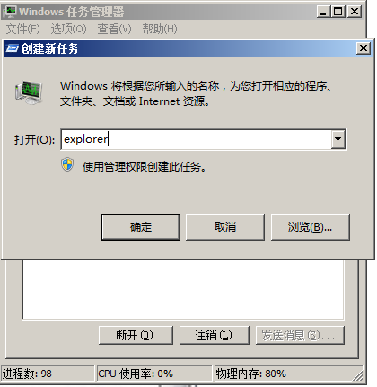 2、接下來點擊文件,新任務個,在彈出的對話框中輸入explorer,點確定。