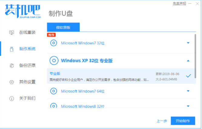 1、下載安裝裝機吧一鍵重裝系統軟件并打開,插入U盤。單擊制作系統,在制作U盤中選擇您的U盤,點擊開始制作。