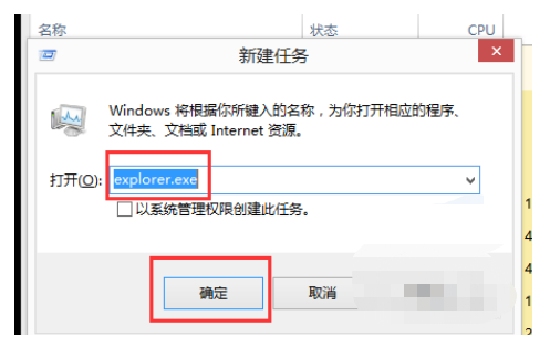 4、在打開的界面中,輸入explorer.exe,并點擊確定就能夠解決這個方法了。