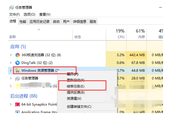 2、接著在打開的對話框中找到Windows資源管理器,鼠標右鍵打開,選擇結束任務或者重新啟動。