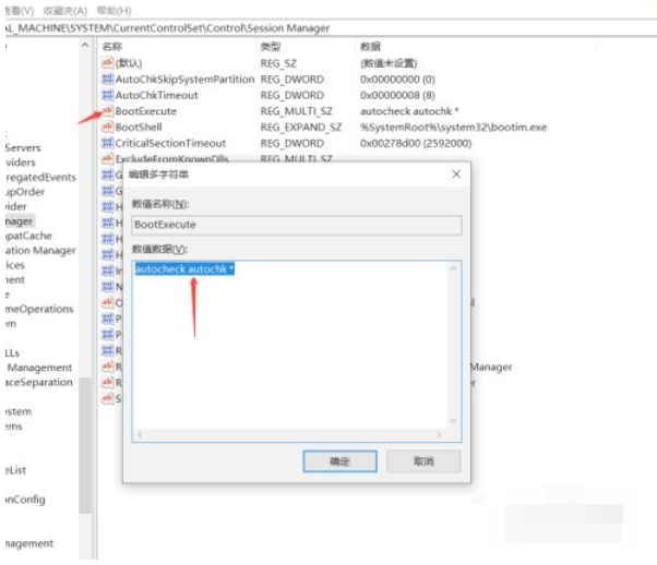 6、此時需要我們找到BootExecute項,鼠標雙擊將其值設置為“ autocheck autochk *”。 經過這樣設置,如果電腦出現藍屏,將會在電腦重啟之后自動運行自檢程序,試圖對系統中存在的錯誤進行修復哦。
