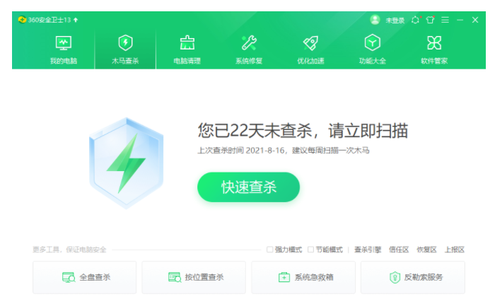 1、下載并打開360安全衛士,點擊“木馬查殺”后點擊“快速查殺”。