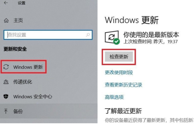 3、此時我們就可以看到左邊的windows更新選項,點擊右邊的檢查更新。