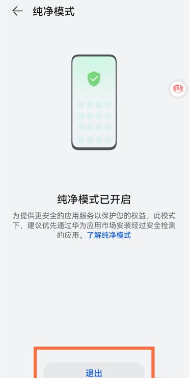 3、點擊【純凈模式】選項后系統會自動【開啟】或者是【關閉】該功能,當跳轉到如下界面后,用戶只需點擊【退出】即可。