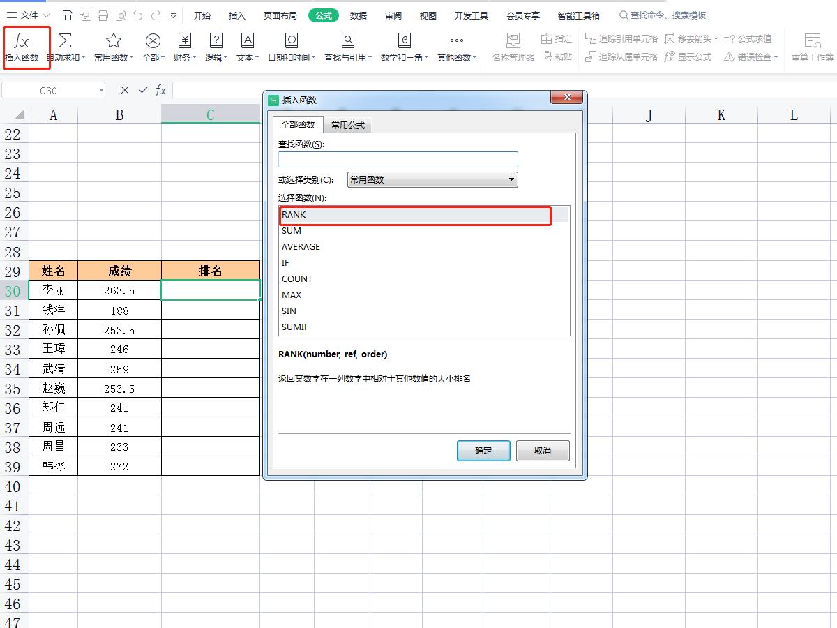 1、選中需要使用函數的單元格,在“公式”頁點擊插入函數,選擇rank函數。