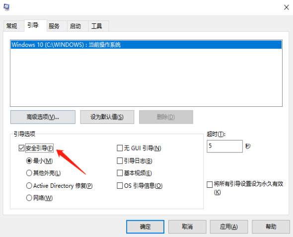 2、來到系統配置界面,選擇啟動選項,檢查安全啟動單擊“確定”。重啟計算機后進入安全模式,使用防病毒軟件檢查并殺死病毒。