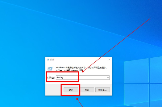 2、在運行面板中輸入“dxdiag”,點擊確定。
