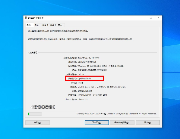 3、進入DirectX診斷工具窗口,可以在系統中查看到電腦系統型號。