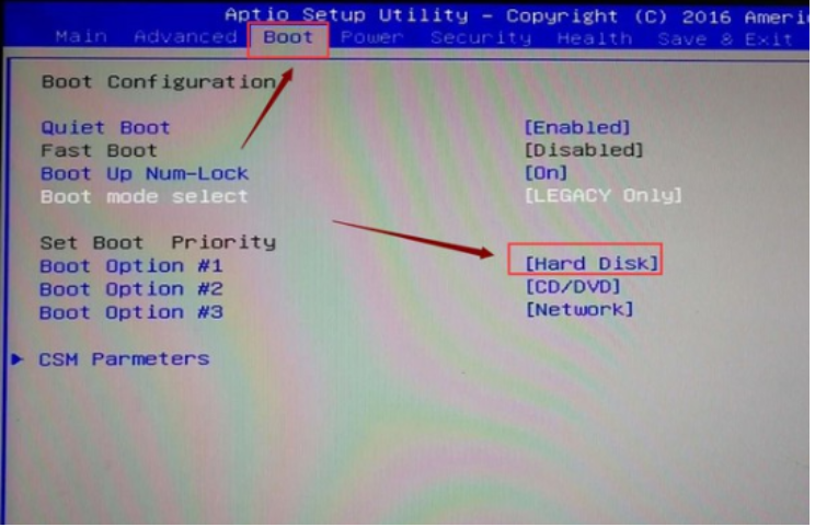 2、進入BIOS后,我們使用左右方向鍵將界面切換至“boot”窗口,回車鍵展開Boot Option #1,將第一啟動項改為硬盤,然后按f10保存即可。