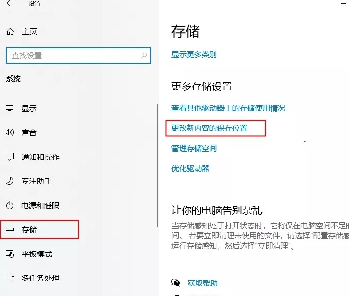 1.為了避免下次將軟件默認安裝在C盤,我們可以通過更改存儲路徑來解決,點擊進入電腦的【設置】-【系統】-【存儲】-【更改新內容的保存位置】。