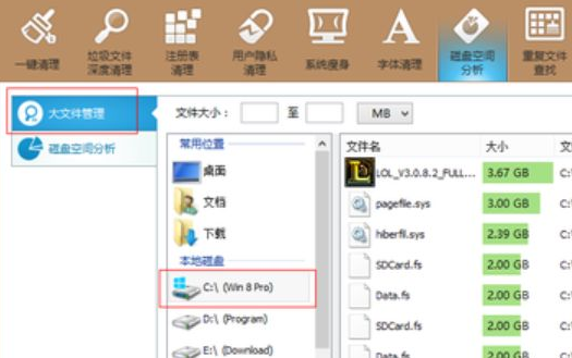 2.點擊大文件管理,選擇C盤。點擊開始分析,會自動為你分析你C盤文件的占用空間大小,方便我們查看是什么占用了C盤的空間,然后我們就可以根據自身需求來決定要刪掉哪些東西了。