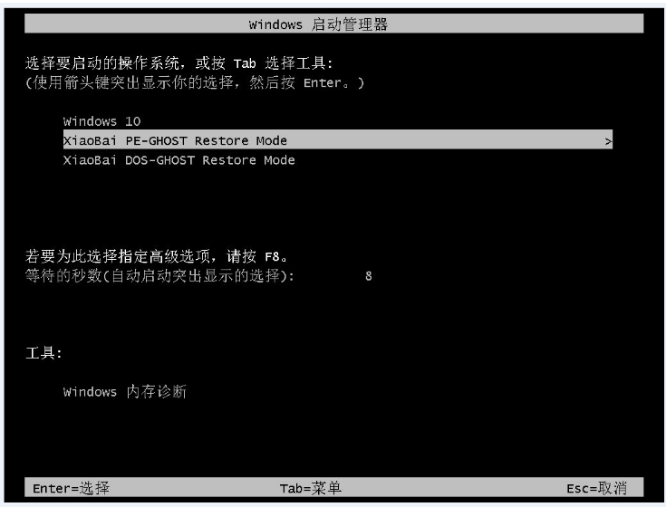 5、進入啟動管理器界面之后,選擇第二項xiaobai pe-ghost,按回車進入pe系統。