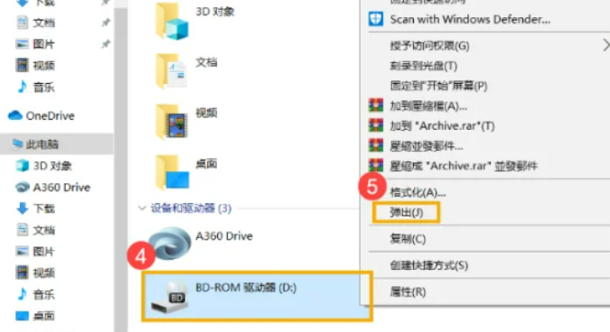3、在此電腦窗口中,于[卡住的光驅圖標]點擊鼠標右鍵④,然后點選[彈出]⑤。