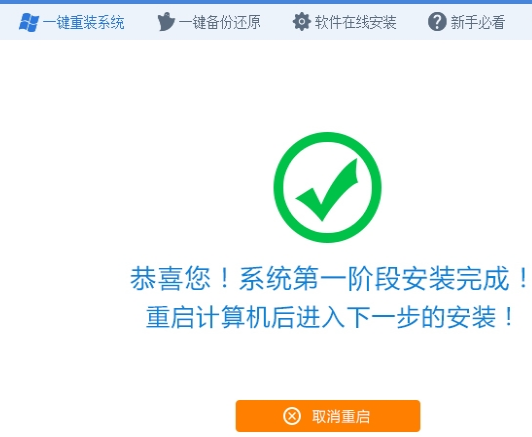 5、下載完成后配置重裝文件,執行倒計時進行系統安裝,第一階段安裝完成后,自動重啟。