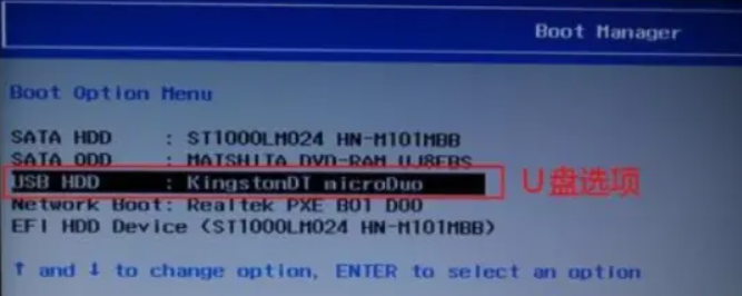 3、在啟動項選擇菜單界面下,選擇usb項,按回車鍵就可以進入U盤重裝頁面。