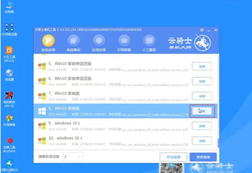9、進入系統后,云騎士軟件會自動打開搜索系統鏡像,找到鏡像,點擊安裝,準備安裝界面中無需更改,點擊開始安裝,選擇繼續,等待安裝。