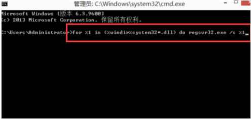3、復制該代碼并輸入管理員頁面中:for %1 in (%windir%system32*.dll) do regsvr32.exe /s %1。