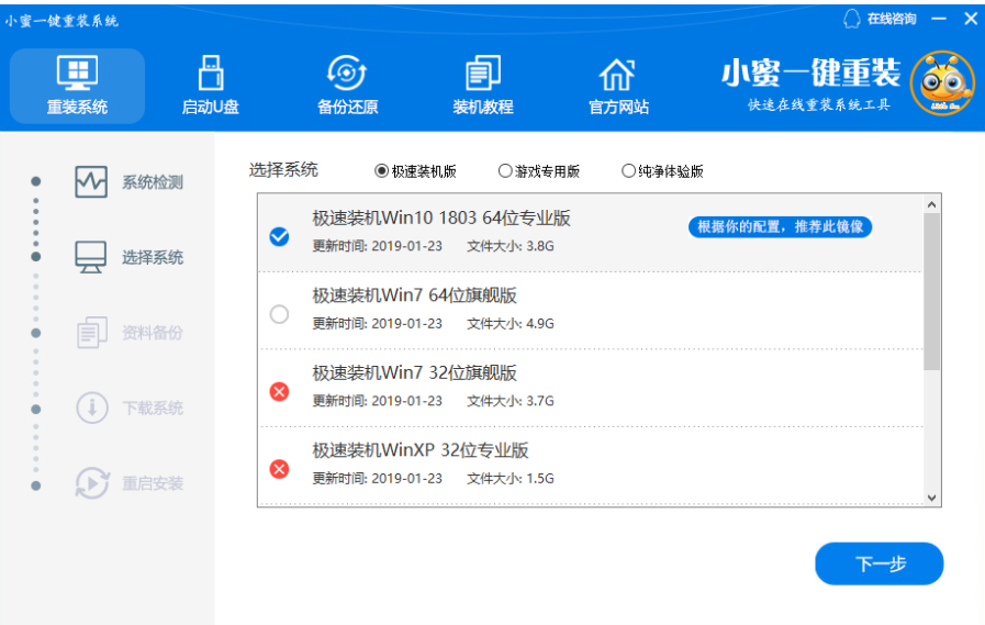 1、如何使用小蜜一鍵重裝系統呢,首先需要下載安裝小蜜一鍵重裝系統,打開后點擊重裝系統選項,等待系統換將檢測完畢后,點擊下一步。