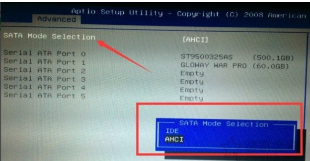 2,接著找到在 SATA Mode Selection(硬盤模式選擇)選項打開,將硬盤模式修改為 IDE 試試,更改完成之后按 F10保存就可以啦。