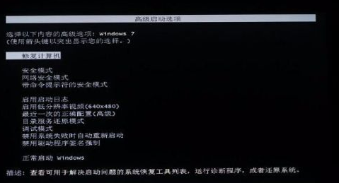 然后我們把電腦斷電之后重新啟動,在電腦啟動的同時按住f8按鈕。如果能出現windows的高級選項的話。基本上系統都還是可用的。所以進入安全模式進行一下殺毒然后重啟電腦就可以了。