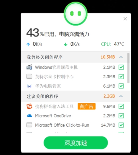 1、單擊小火箭加速,右鍵單擊出深度加速,也可以單擊殺毒軟件,進行加速。