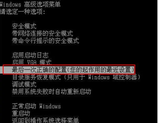 1、開機按f8不動到高級選項出現在松手,選“最近一次的正確配置”回車修復。
