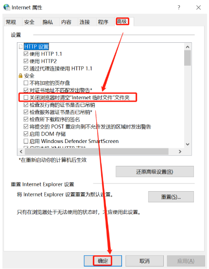 3、鼠標點擊屬性內的【高級】選項卡,勾選【關閉瀏覽器時清空Internet臨時文件夾】并點擊確定即可清理。