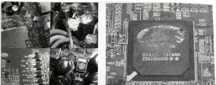 因為主板構成復雜,電路、電子器件和插口多,同時很多主板上還集成了顯卡、聲卡和網卡芯片等,一旦出現撞擊、雷電或者異物等情況,就容易導致主板的損壞或者燒毀,如下圖。