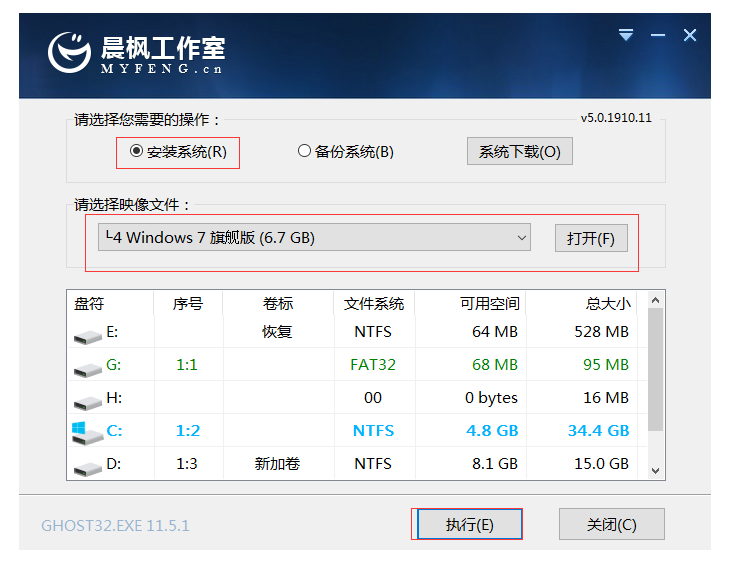 3. 進入pe系統后,打開晨楓軟件,選擇【安裝系統】,點擊【打開】,選擇提前下載好的win7鏡像系統,并選擇將系統安裝到c盤上,完成以上設置后點擊【執行】。