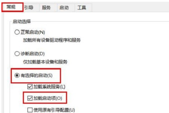 2.選擇“常規”,點擊“有選擇的啟動”,再點擊清除“加載啟動項”上面的勾。