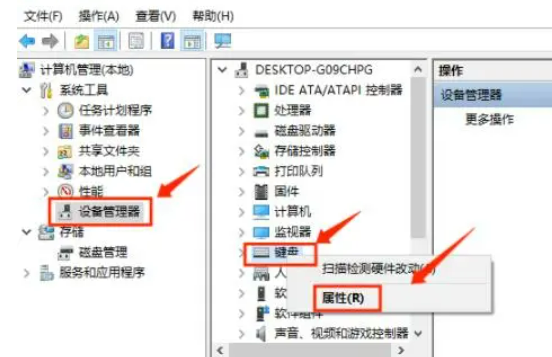 2、在管理界面上,點擊左側的設備管理器,接著右鍵 點擊鍵盤再去點擊屬性。