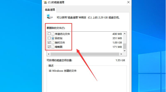 3、勾選需要刪除的文件,如“臨時文件”、“縮略圖”等。