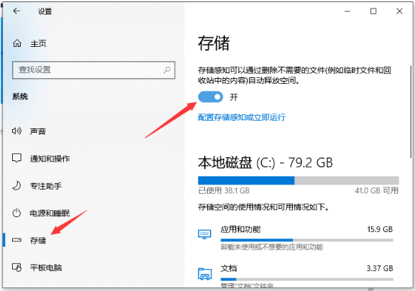 2、依次選擇“系統”--“存儲”,然后在右側“開啟儲存感知功能”,這時候系統就會自動清理臨時文件。