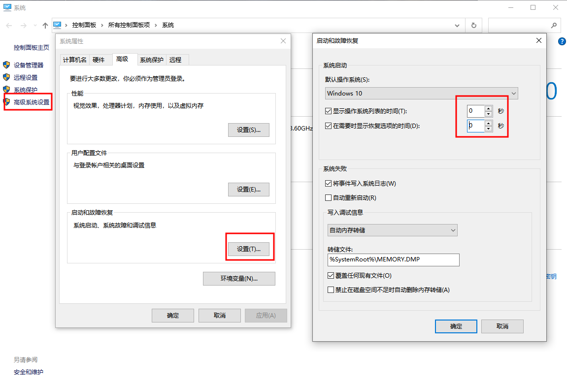 右擊【我的電腦】選擇【屬性】,選擇【高級系統設置】,在“啟動和故障”一欄點擊【設置】,把“系統啟動”一欄的兩個時間都改為0秒,再點擊【確定】,這樣也能提高開機速度。